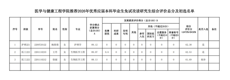 【公示】医学与健康工程学院推荐2026年优秀应届本科毕业生免试攻读硕士研究生初选名单公示 |