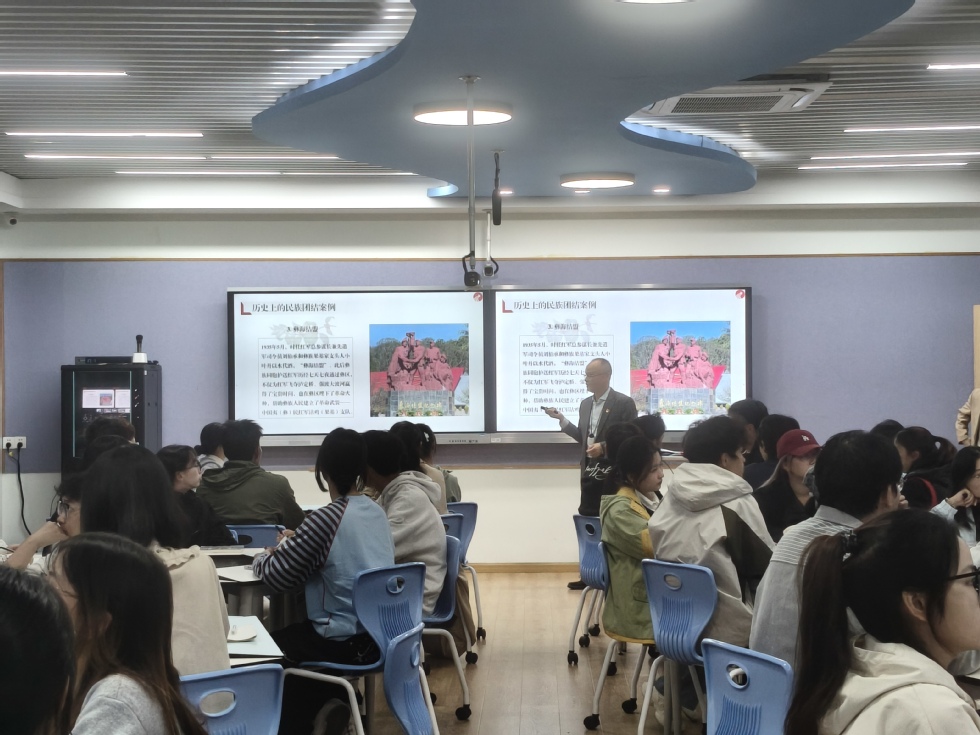 为深化青年学子对中华民族多元文化的了解,促进不同民族习俗风尚的学习交流,11月5日晚,医学与健康工程学院团委在W1704智慧教室成功举办第七期青马培训第二讲暨新思想公开课。学院党委书记张继延受邀担任主讲,为青马学员带来一场主题鲜明、内容丰富的民族文化讲座。 本次讲座以“铸牢中华民族共同体意识,共绘各族团结同心圆画卷”为核心主题。张书记从“逢年过节常用长桌吃饭的民族”这一生动问题切入,以独具特色的“长桌宴”习俗为线索,逐步引导同学们深入了解壮族、维吾尔族、布依族等少数民族丰富多彩的文化传统与风俗习惯。讲座过程中,张书记讲述深入浅出,案例详实。同学们积极响应,思绪活跃,在问答与互动环节踊跃发言。现场学习氛围浓厚,师生交流顺畅,展现出良好的教学相长态势。活动尾声,全体师生共同高歌《我和我的祖国》,用激昂嘹亮的歌声表达对祖国的深沉热爱,也为本次青马培训画上了圆满的句号。 本次培训紧密结合学院聚焦民族文化的研究方向,有效增强了同学们的文化认同与民族凝聚力。活动不仅是对中华优秀传统文化精神脉络的传承,更是从历史智慧中汲取营养,为新时代青年的成长与发展提供了宝贵的精神动力与灵感源泉。(通讯员/邵梦逸 审核/张继延 编辑/陈光浩)