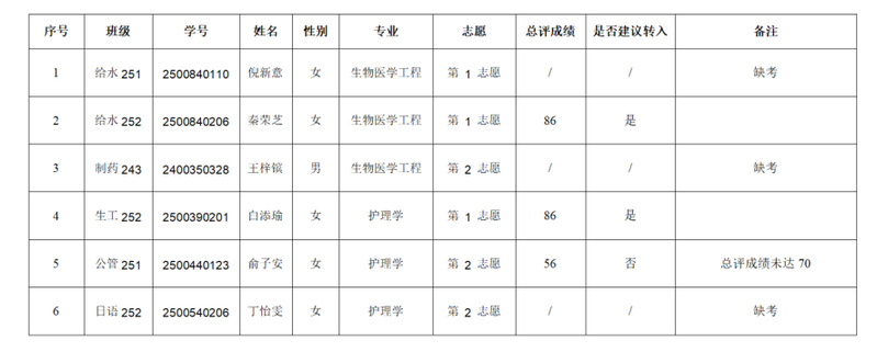 根据《2025-2026-2学期本科学生转专业各学院拟接纳生数与考核办法》中医工学院转专业具体要求和考核办法,现将我院转专业考核结果公示如下: