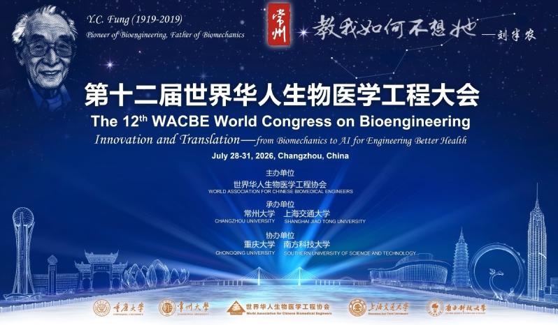 大会简介: “第十二届世界华人生物医学工程大会”将于2026年7月28日至31日在江苏常州富都洲际酒店召开。大会由世界华人生物医学工程协会(World Association for Chinese Biomedical Engineers, WACBE)主办,自2002年创办以来,每两年举办一次,旨在为全球生物医学工程领域的华人学者、工程师、医学专家、产业界精英以及青年学生搭建一个高水准、国际化的交流平台,现已成为华人生物医学工程界的重要学术会议之一。 此次大会在江苏常州召开,是对已故世界生物医学工程先驱、生物力学之父冯元桢先生的崇高致敬,让我们在其故乡共同庆祝以“生物医学工程创新与转化:从生物力学到人工智能,为更好的健康赋能”为主题的盛会召开。此次大会聚焦生物医学工程的基础前沿、关键技术以及产业发展等热点话题,内容涵盖人工智能、生物材料、医学影像、生物力学、生物传感、脑机接口、生物制造、创新与转化以及生物医学工程教育等众多关键领域。 大会期间将颁发冯元桢终身成就奖、胡流源卓越报告奖、吴望一杰青奖、WACBE新星奖,评选大会最佳论文和最佳海报,并开展创新创业项目路演及竞赛。 此外,大会期间还将举办生物医学工程仪器、医材的产品展览、观摩及技术交流等活动,实现产学研深度联动。我们诚挚欢迎国内外生物医学工程领域的相关人士踊跃参会,共襄盛会!